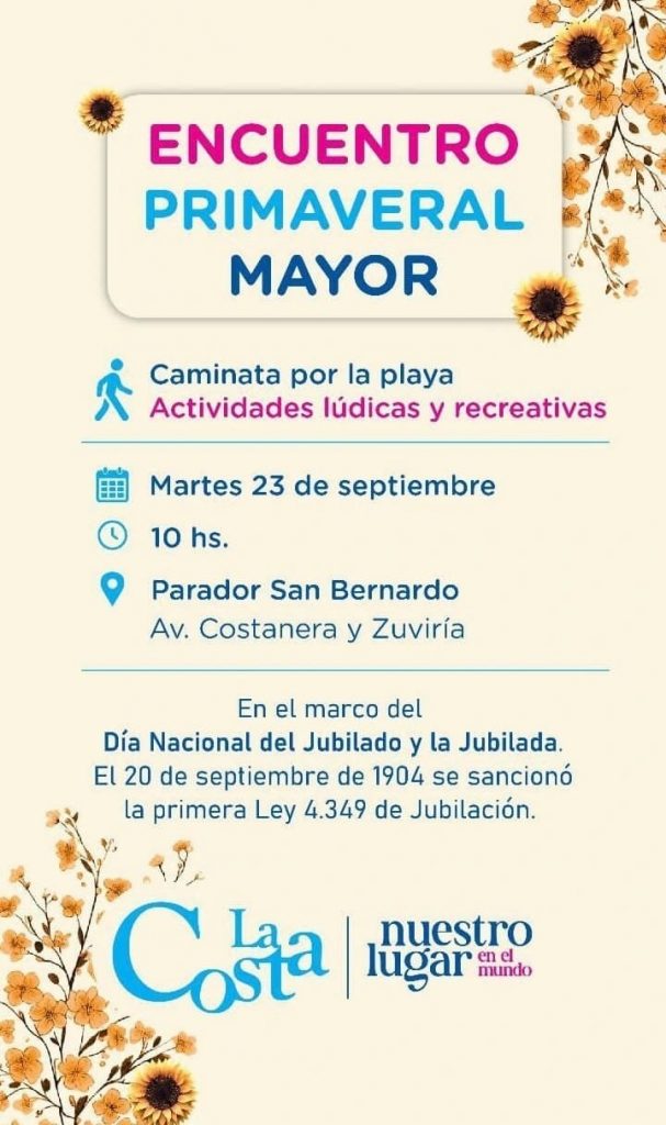 Hoy martes a las 10, el Parador Municipal recibirá a jubiladas y jubilados del distrito para celebrar la llegada de la primavera con una caminata por la playa y propuestas recreativas. La jornada se enmarca en el Día Nacional de la Jubilada y el Jubilado.